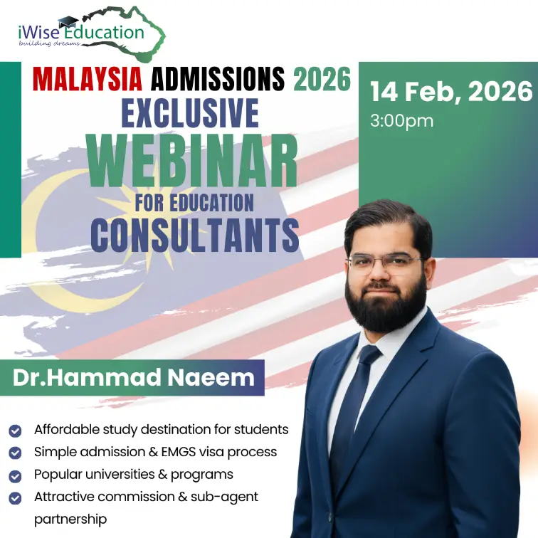 Join our exclusive webinar designed specifically for education consultants who want to expand their student recruitment opportunities in Malaysia. In this session, industry expert Dr. Hammad Naeem will share valuable insights about Malaysia admissions for 2026, including affordable study options, popular universities, and high-demand programs for international students. You will also learn about the simplified admission process, EMGS visa procedures, and how consultants can benefit from attractive commission structures and sub-agent partnerships. This webinar will help you understand the Malaysian education market and discover new ways to grow your consultancy business while providing students with quality and affordable study destinations